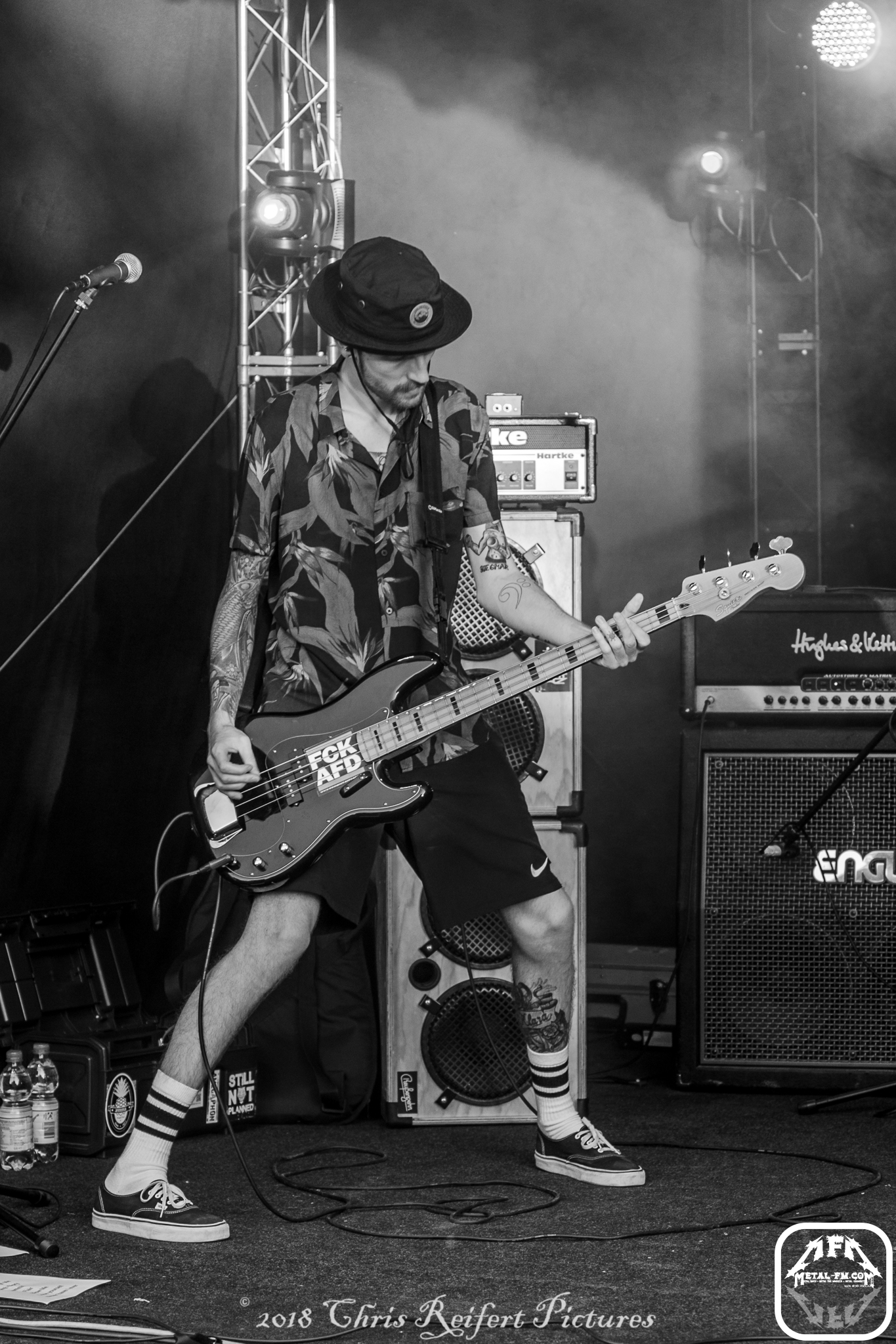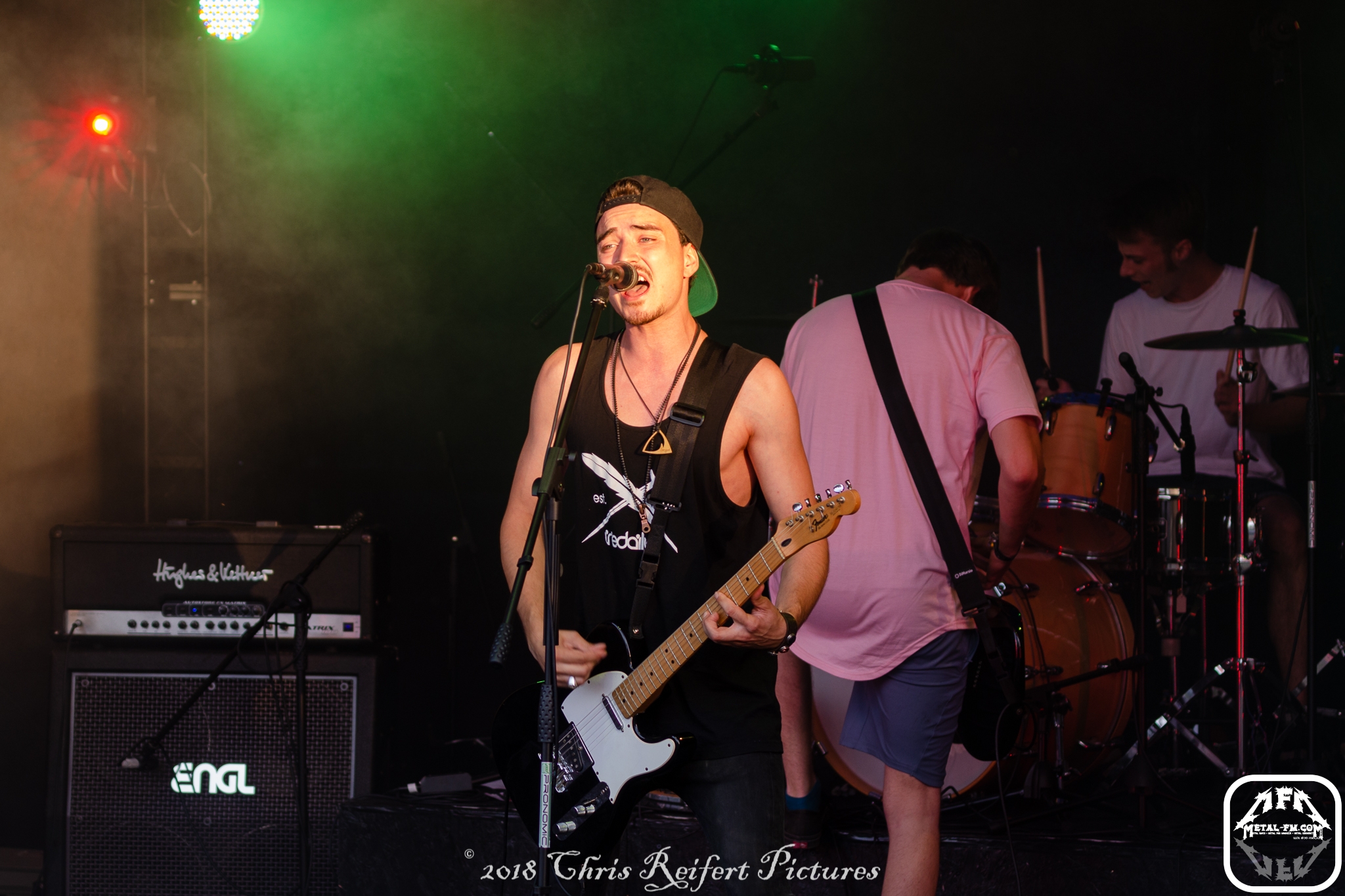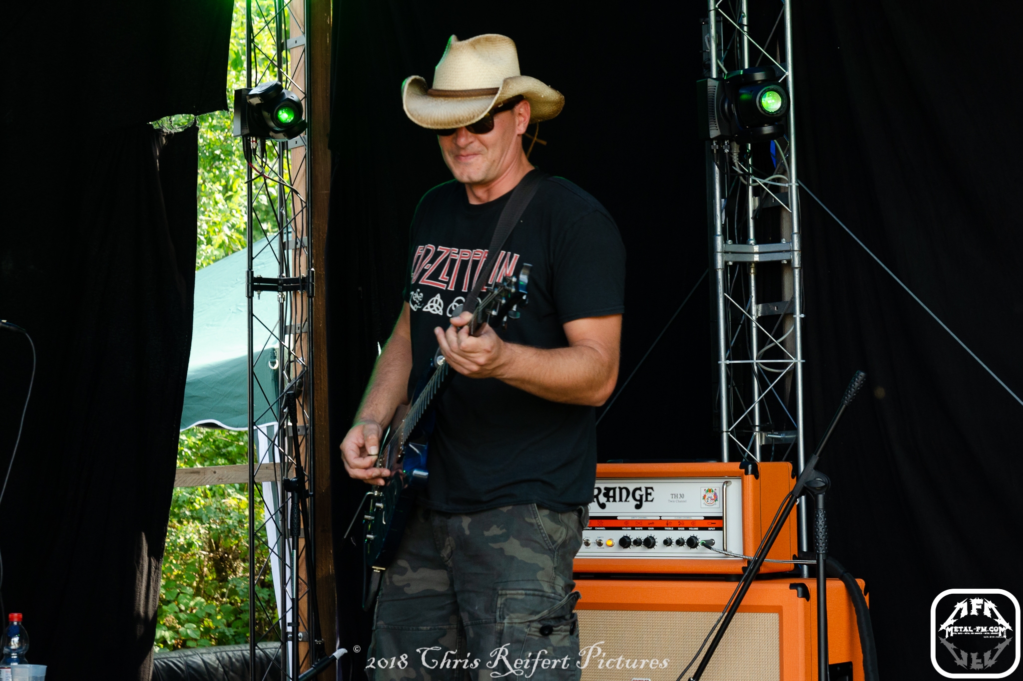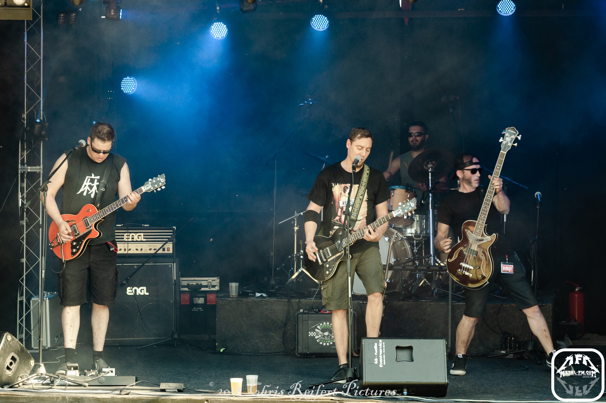 Nachdem sich alle von den Strapazen des Vortages erholt hatten, folgte nun der zweite Teil dieses kleinen und gemütlichen Festivals. Es begannen „Pushseven 12“ um Sänger und Gitarrist „Roman Scherer“ aus dem Rhein-Main-Gebiet. Die sich langsam einfindenden Besucher fanden schnell gefallen an den Klängen die um ihre Ohren flogen und so konnte die Veranstaltung seinen weiteren Verlauf nehmen. Man merkte relativ schnell, dass die Erholung der Nacht allen anwesenden wieder Kraft gegeben hatte. Im Anschluss betraten „Green Machine“ um Frontman „Chris“ mit ihrem Mix aus Rock´n´Roll, PunkRock und StoneRock die Location und heizten dem Publikum ordentlich, trotz der des Wetter geschuldeten Hitze, ein. So wusste jeder der vier Jungs die Masse zu begeistern. Man merkte schon früh, welch Potenzial in diesem Abend steckte. Auch ließ sich „Zwischenmensch“ nicht lange bitten die Bühne zu betreten. Die Jungs aus dem hessischen Darmstadt rockten aber in aller Routine ihr Programm aus deutschsprachigen Post Hardcore ab, was sich auch in der Performance der vier Musiker zeigte. Als wahrhaft lustige Truppe gesellte sich nun „Andy´s Sister“ auf die Bühne. Mit ihrem bunten Mix aus eigenen und Cover-Songs konnten sie schnell Fuß fassen und auf den bevorstehenden Hauptact vorbereiten. Auch wussten die Jungs ihre gute Laune zu versprühen.