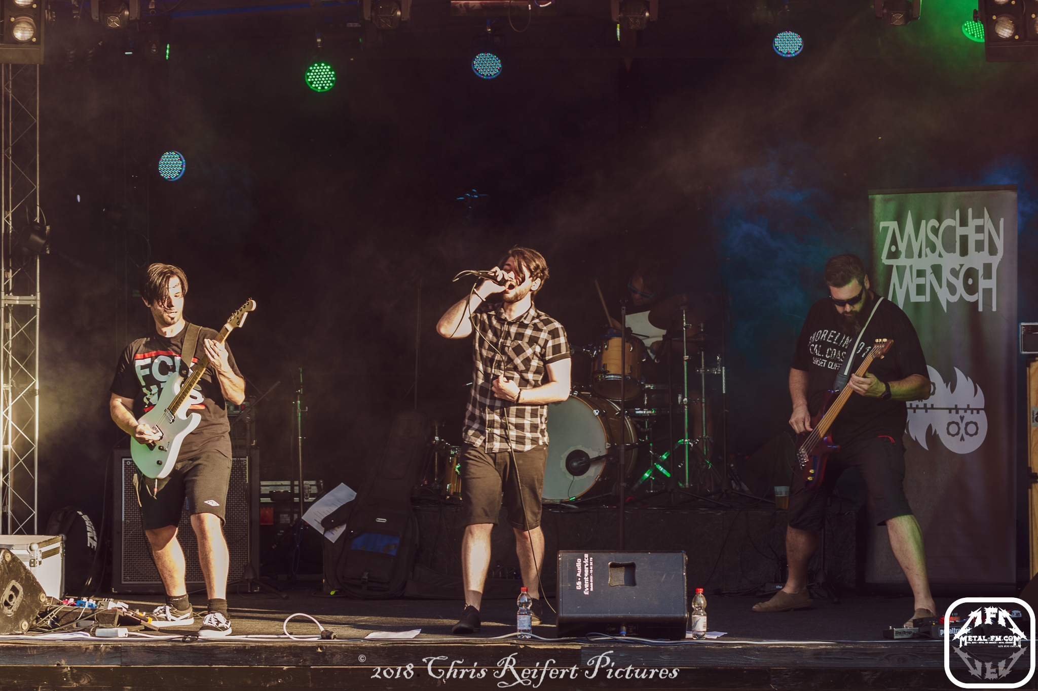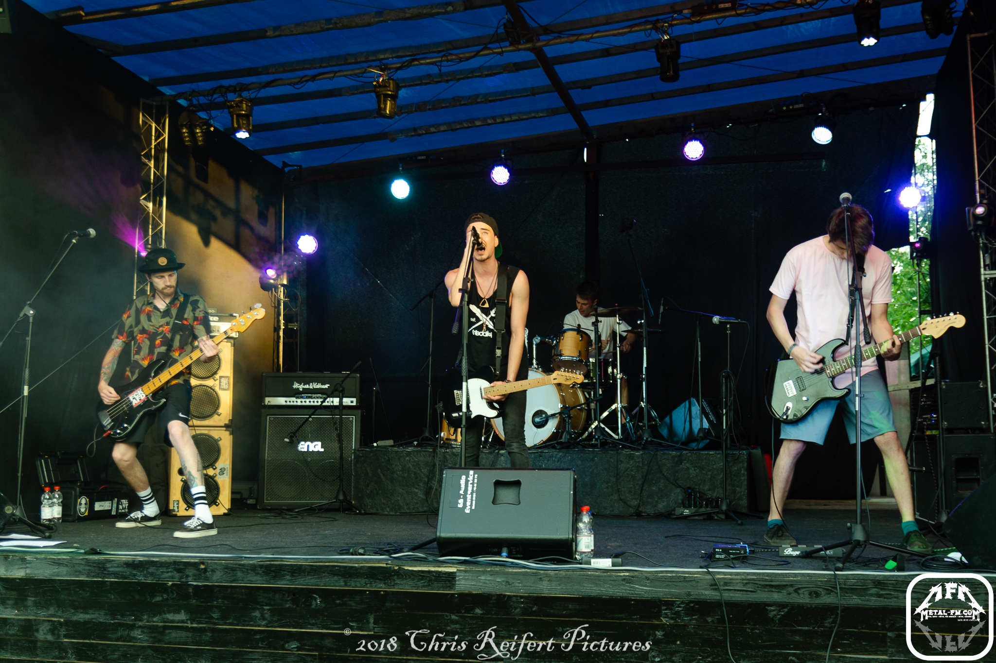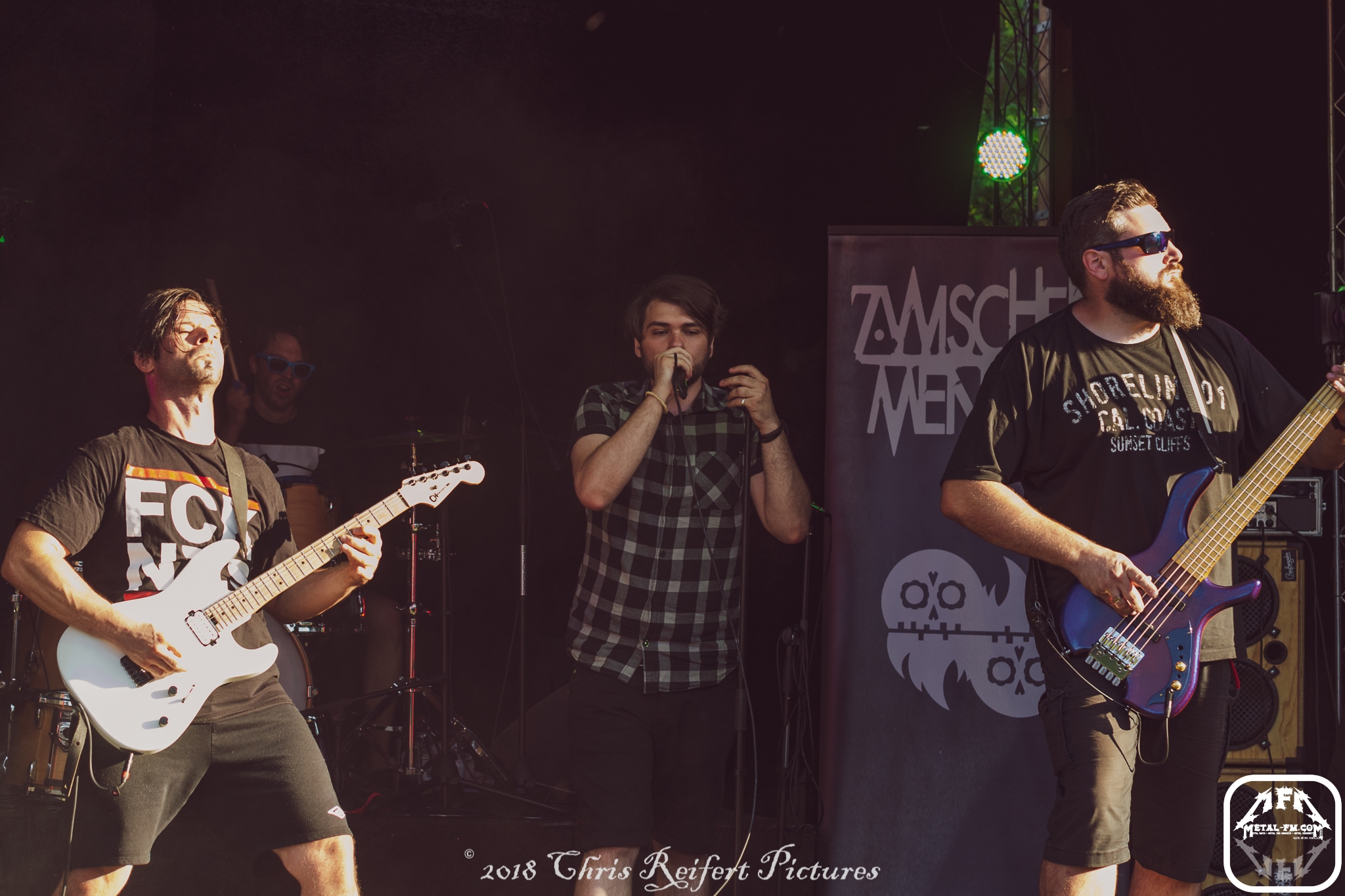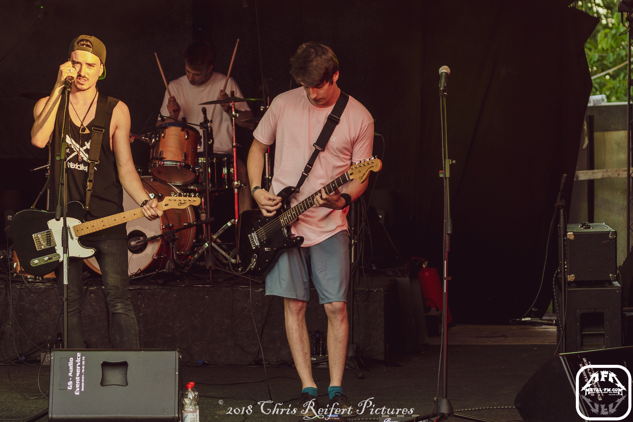 Nachdem sich alle von den Strapazen des Vortages erholt hatten, folgte nun der zweite Teil dieses kleinen und gemütlichen Festivals. Es begannen „Pushseven 12“ um Sänger und Gitarrist „Roman Scherer“ aus dem Rhein-Main-Gebiet. Die sich langsam einfindenden Besucher fanden schnell gefallen an den Klängen die um ihre Ohren flogen und so konnte die Veranstaltung seinen weiteren Verlauf nehmen. Man merkte relativ schnell, dass die Erholung der Nacht allen anwesenden wieder Kraft gegeben hatte. Im Anschluss betraten „Green Machine“ um Frontman „Chris“ mit ihrem Mix aus Rock´n´Roll, PunkRock und StoneRock die Location und heizten dem Publikum ordentlich, trotz der des Wetter geschuldeten Hitze, ein. So wusste jeder der vier Jungs die Masse zu begeistern. Man merkte schon früh, welch Potenzial in diesem Abend steckte. Auch ließ sich „Zwischenmensch“ nicht lange bitten die Bühne zu betreten. Die Jungs aus dem hessischen Darmstadt rockten aber in aller Routine ihr Programm aus deutschsprachigen Post Hardcore ab, was sich auch in der Performance der vier Musiker zeigte. Als wahrhaft lustige Truppe gesellte sich nun „Andy´s Sister“ auf die Bühne. Mit ihrem bunten Mix aus eigenen und Cover-Songs konnten sie schnell Fuß fassen und auf den bevorstehenden Hauptact vorbereiten. Auch wussten die Jungs ihre gute Laune zu versprühen.