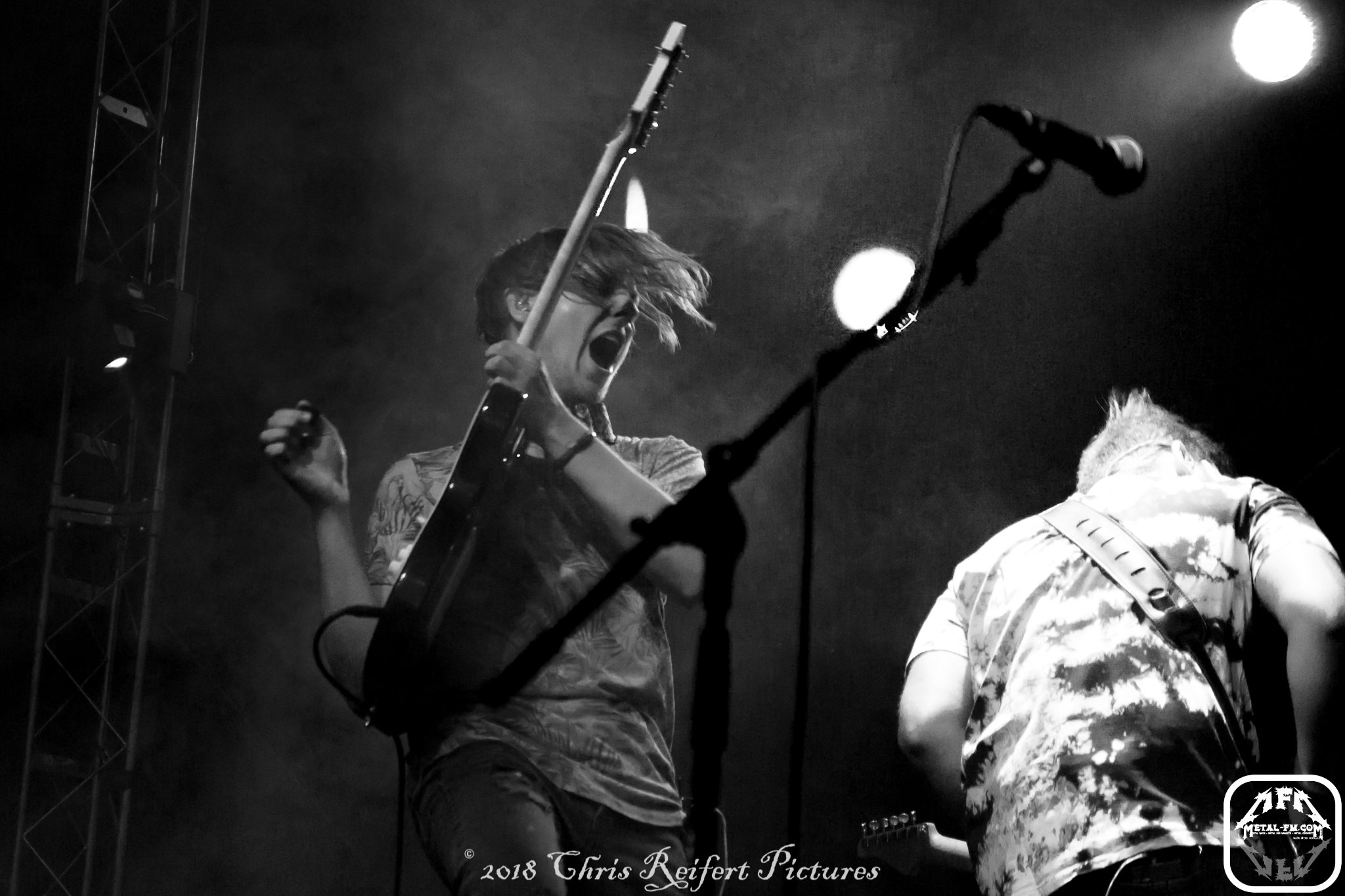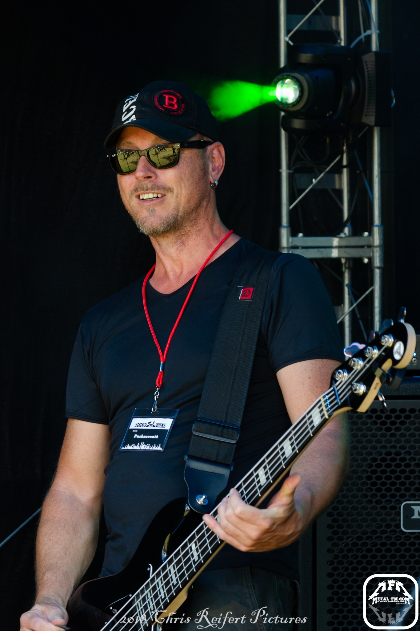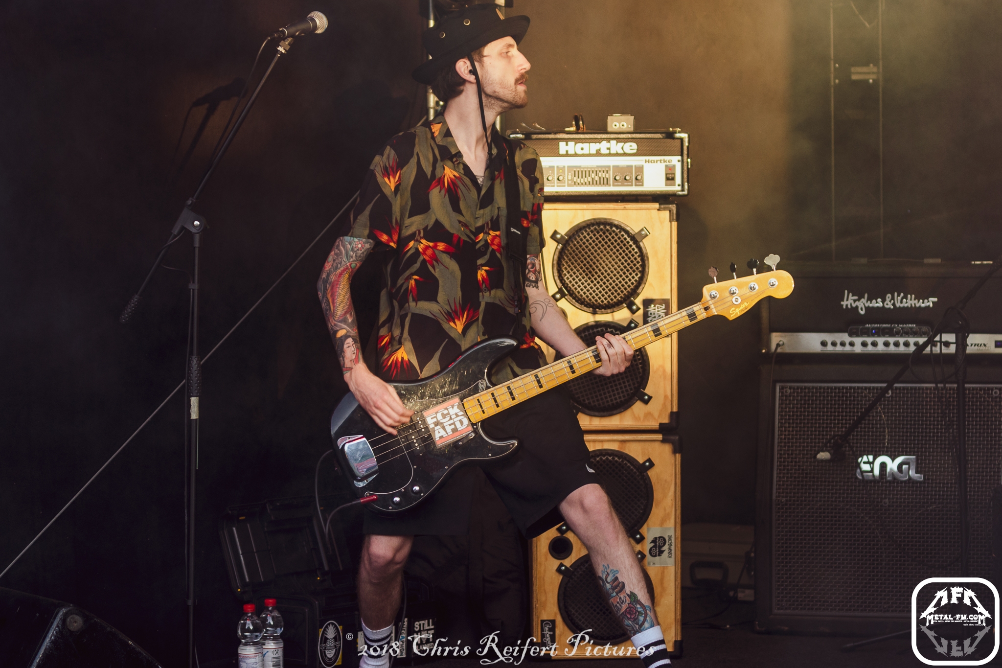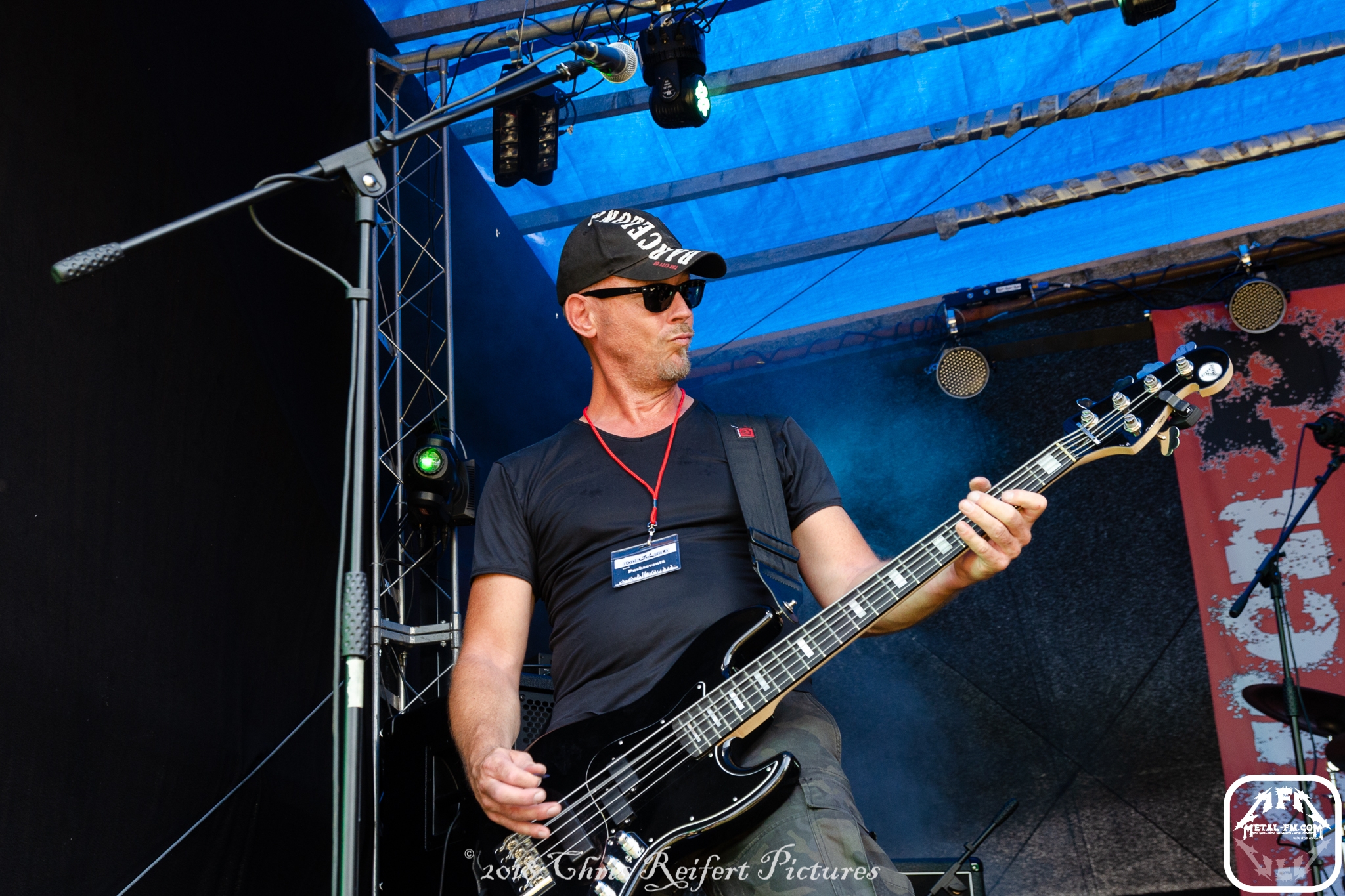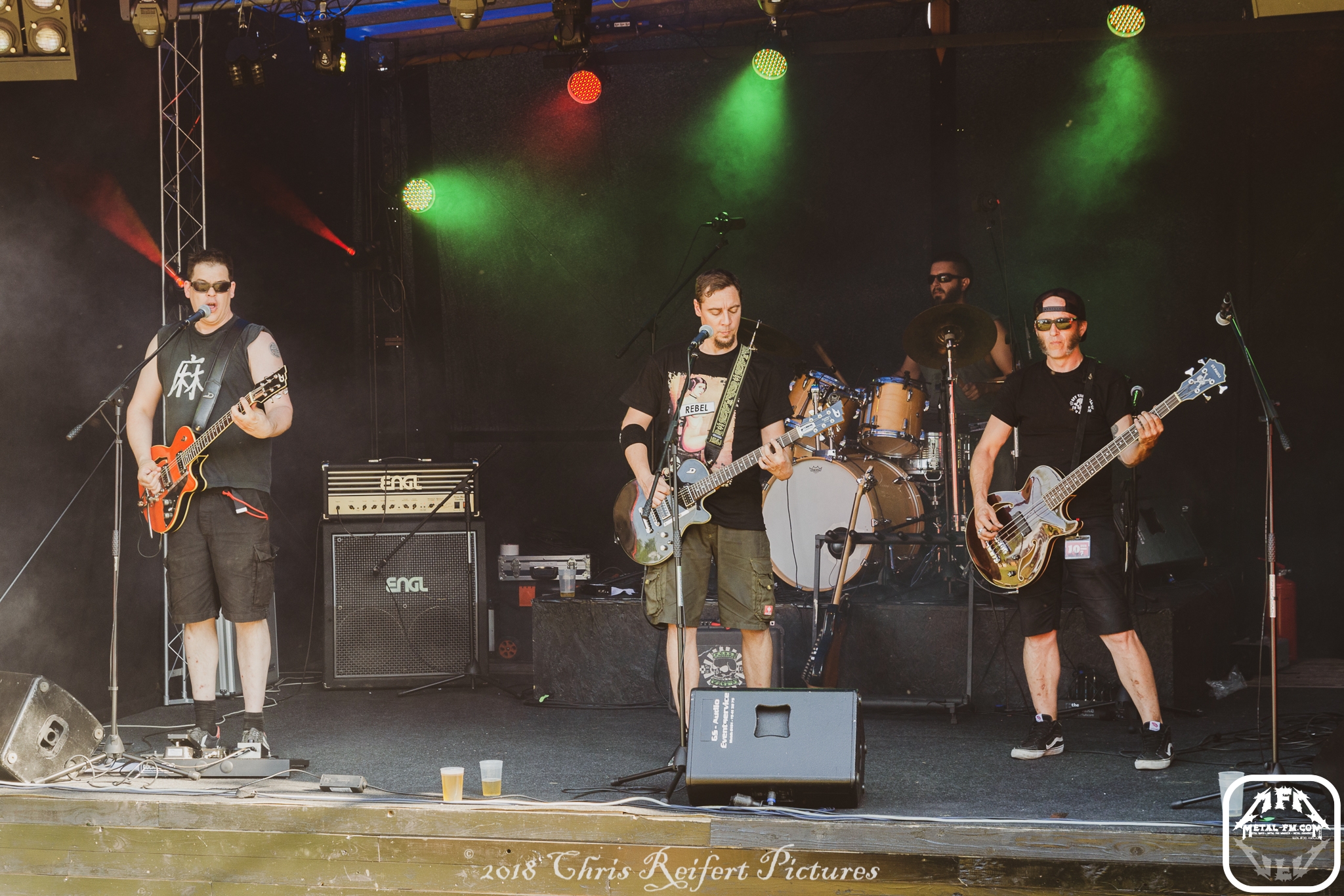 Nachdem sich alle von den Strapazen des Vortages erholt hatten, folgte nun der zweite Teil dieses kleinen und gemütlichen Festivals. Es begannen „Pushseven 12“ um Sänger und Gitarrist „Roman Scherer“ aus dem Rhein-Main-Gebiet. Die sich langsam einfindenden Besucher fanden schnell gefallen an den Klängen die um ihre Ohren flogen und so konnte die Veranstaltung seinen weiteren Verlauf nehmen. Man merkte relativ schnell, dass die Erholung der Nacht allen anwesenden wieder Kraft gegeben hatte. Im Anschluss betraten „Green Machine“ um Frontman „Chris“ mit ihrem Mix aus Rock´n´Roll, PunkRock und StoneRock die Location und heizten dem Publikum ordentlich, trotz der des Wetter geschuldeten Hitze, ein. So wusste jeder der vier Jungs die Masse zu begeistern. Man merkte schon früh, welch Potenzial in diesem Abend steckte. Auch ließ sich „Zwischenmensch“ nicht lange bitten die Bühne zu betreten. Die Jungs aus dem hessischen Darmstadt rockten aber in aller Routine ihr Programm aus deutschsprachigen Post Hardcore ab, was sich auch in der Performance der vier Musiker zeigte. Als wahrhaft lustige Truppe gesellte sich nun „Andy´s Sister“ auf die Bühne. Mit ihrem bunten Mix aus eigenen und Cover-Songs konnten sie schnell Fuß fassen und auf den bevorstehenden Hauptact vorbereiten. Auch wussten die Jungs ihre gute Laune zu versprühen.